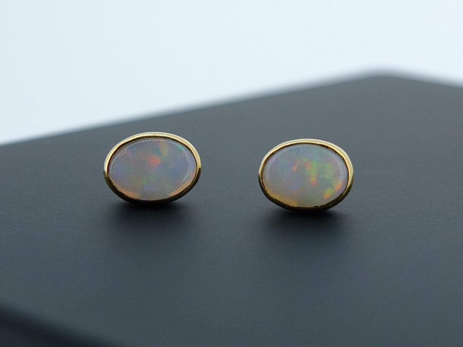 Golden stud earrings, hand crafted by Manjula set into a Bezel with18ct Yellow Gold - Sourced sustainably through out collection of sellers these simple & elegant oval Opals display irridescant fire, moving from red to green then to blue, with flecks of yellow.
