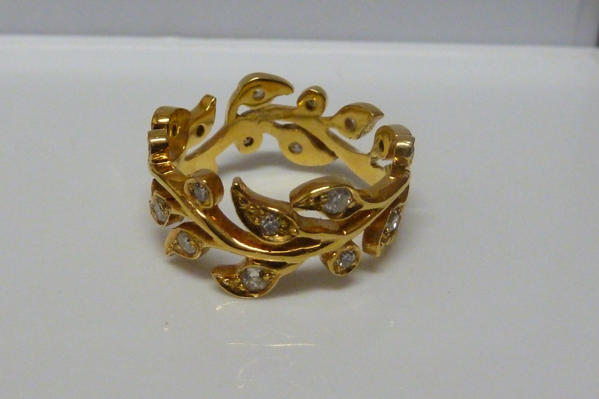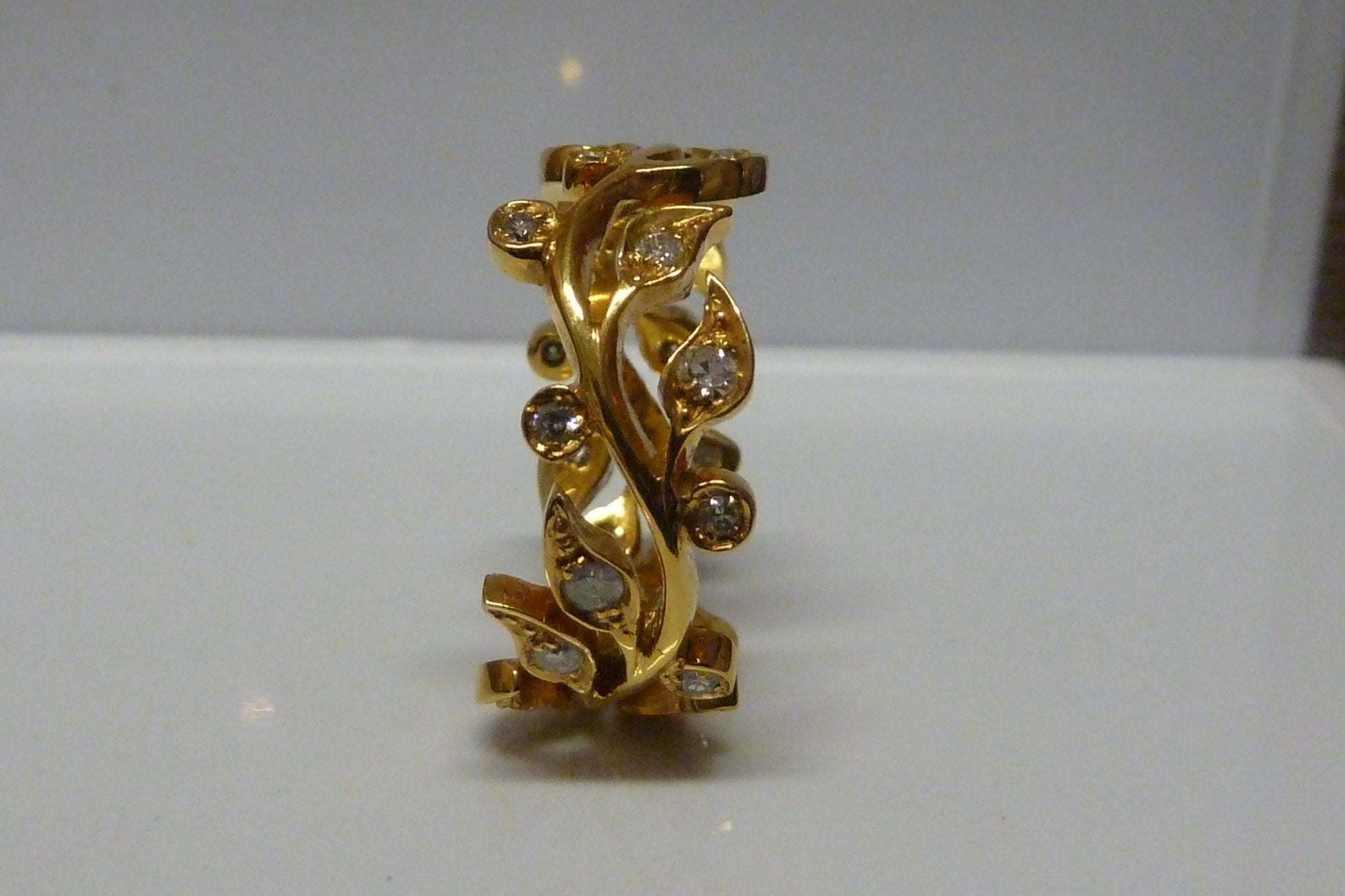 Elegantly designed and crafted to wrap your finger in the simply finery of exquisite design and quality material. Florally inspired with a leave and drop pattern, this subtly striking Ring suits both formal and everyday wear, mind the lustrous 18ct Gold though. All items in this section have been crafted by M.Damuni who owns and runs Celyon Gems & Jewellery. Based in St. Ives, Cambridgeshire with origins in the mysterious and treasure ridden Island of Celyon, Manjula sources from Home the many precious Gems that adorn his works.