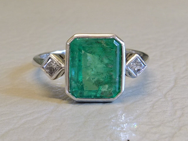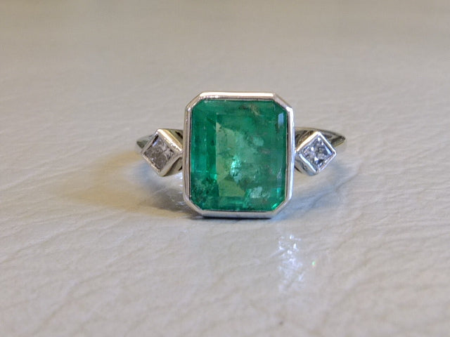 Natural, native and alluring. this Comlombian born, 4.33ct Emerald has been expertly set into 18k White Gold, adorned with shoulders of Diamond.